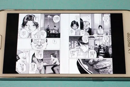 Galaxy S5なんですが、見開き(2ページ)で読むのも可能だと思います。ひらがなのルビが読めるかどうかの境界ラインにはなるけど、この大きさでセリフとかは普通に読めるので、見開き派も検討してみる価値ありかなと思う。