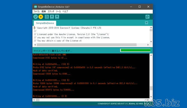 うまくいくと、こんな感じで画面が流れて行って、書き込み成功して、スケッチが実行されます。