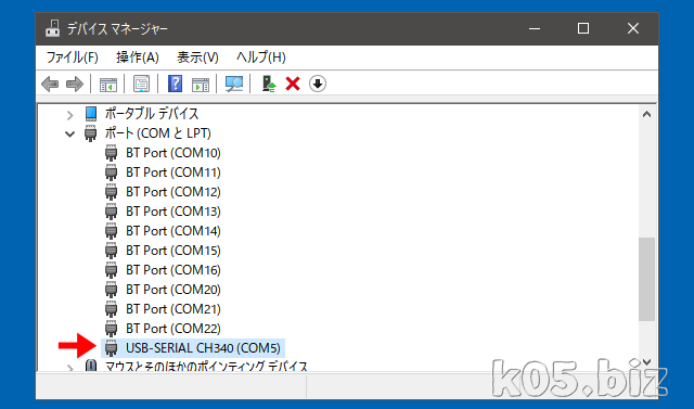 Windowsのデバイスマネージャーで、接続されているポートが確認できます。画像だとCOM5です。