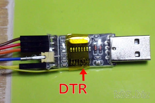 使用したUSB to TTL (CH340)モジュールは、DTR信号が出ていないので、ICピンから直接DTR信号を取り出して接続しました