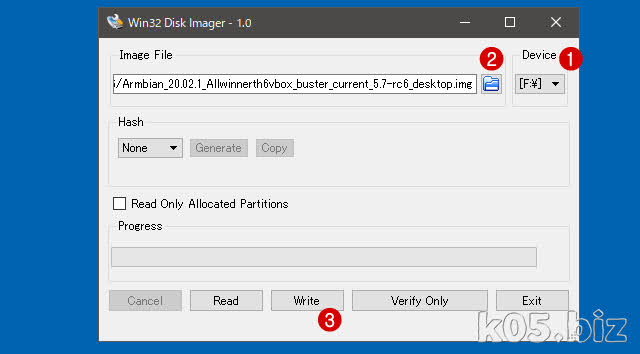 展開(解凍)した上記のファイルをSDカードに書きこみます。イメージを書きこむツールは好きなものでよいと思いますが、今回はWin32 Disk Imagerを使いました。